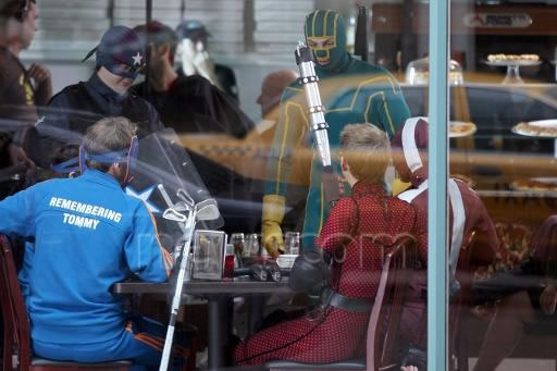 “Kick-Ass 2” continua sendo filmado em Toronto, e agora no set é possível ver boa parte da liga de heróis Justiça Para Sempre.