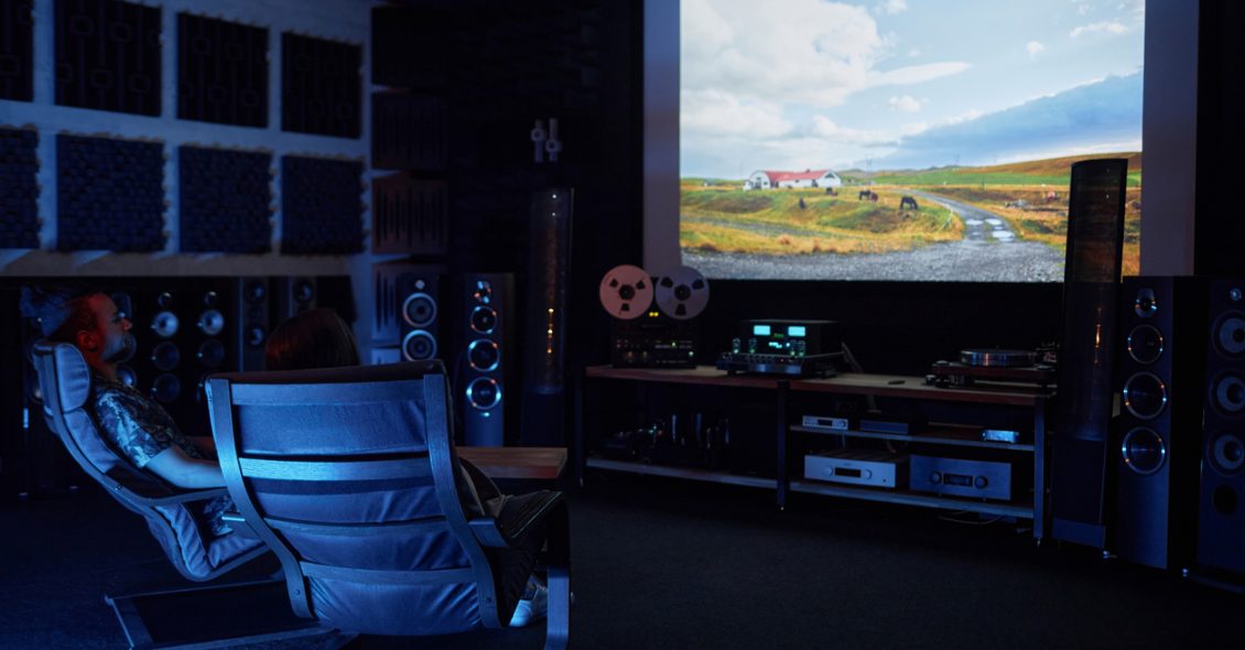 O áudio é uma das peças-chave para que a experiência se aproxime da vivida em salas comerciais. Sistemas de som com múltiplos canais, como 5.1 ou 7.1, podem ser instalados com caixas posicionadas ao redor do ambiente, criando uma sensação imersiva.